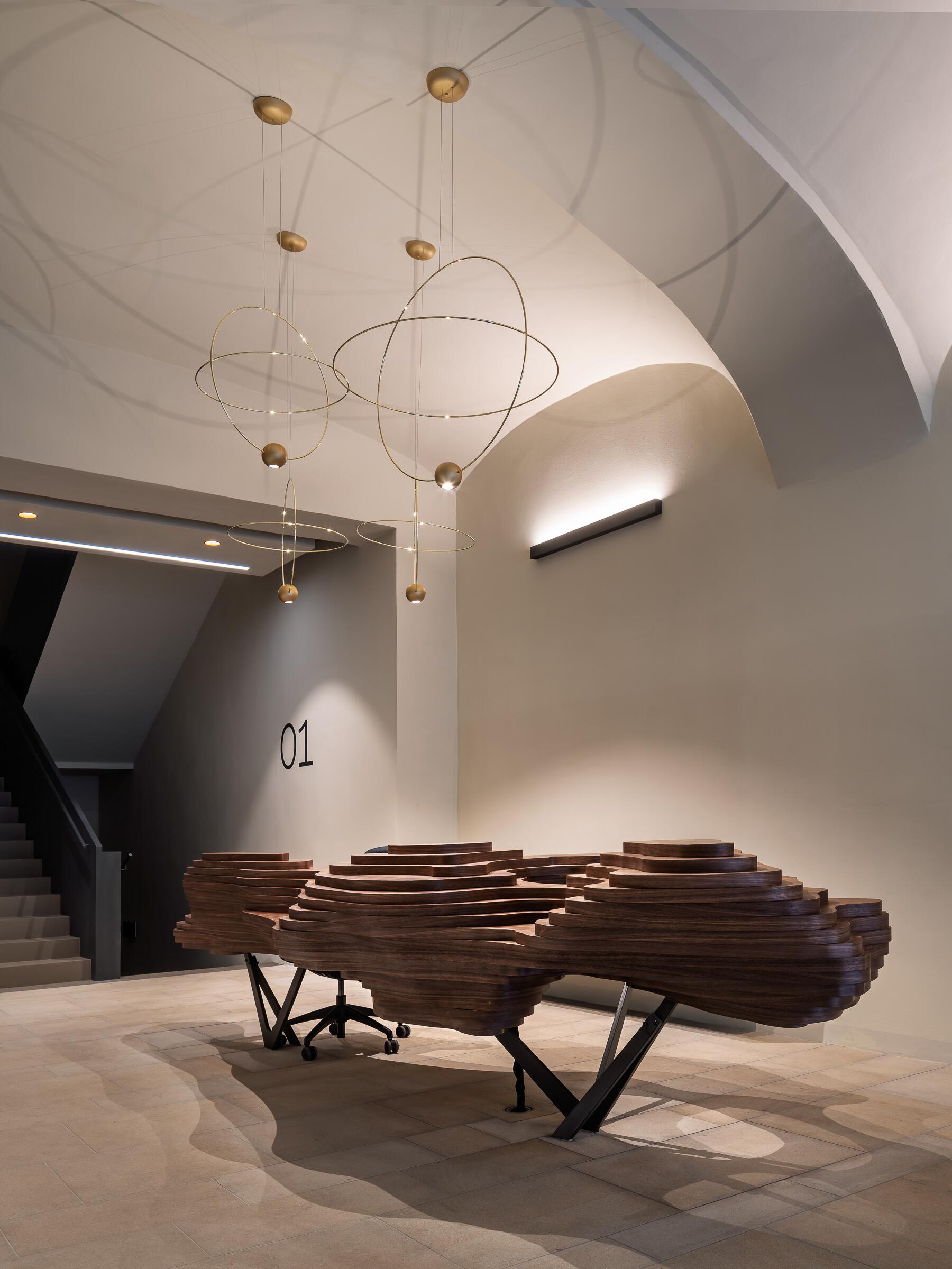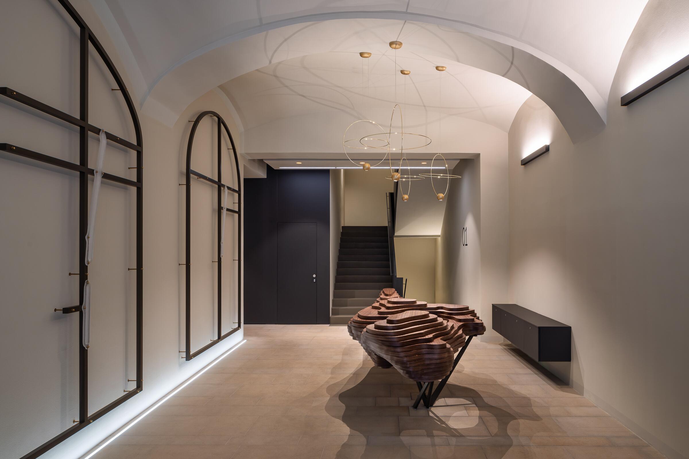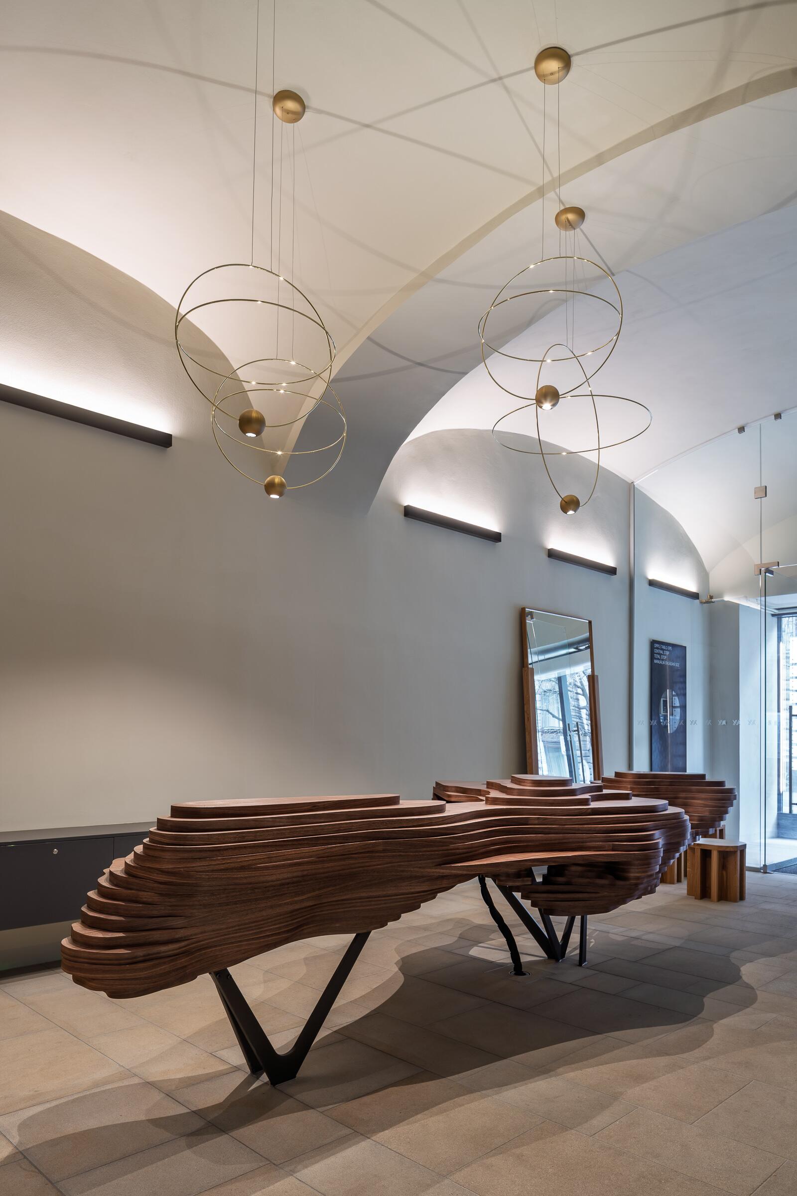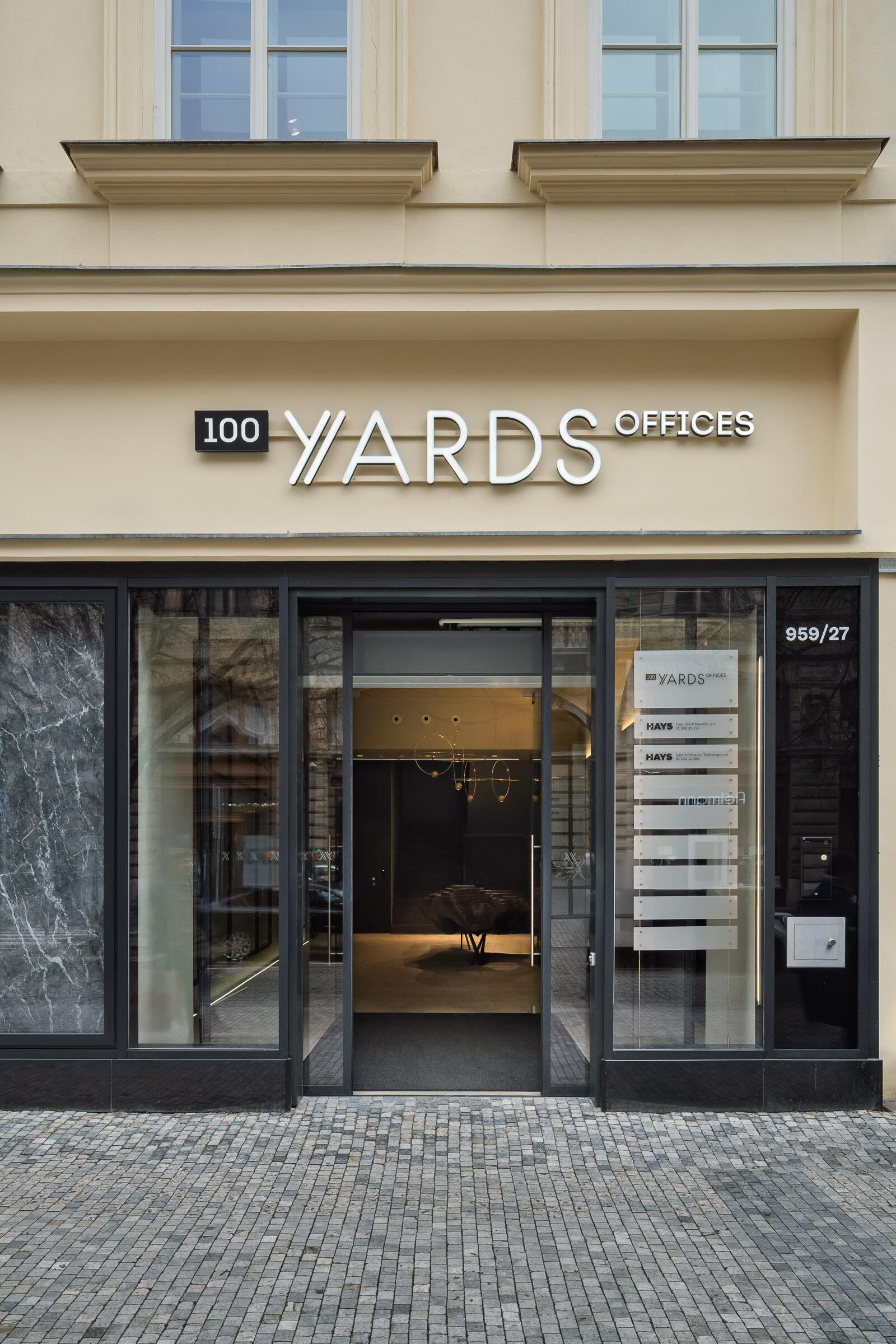 The wall art piece works with the shape of 14th-century city wall built along the moat that originally ran down Na Příkopě street. This shape is divided into four glass segments, which are partly repeated on wooden frames inspired by the shape of shop windows. While the glass shapes gradually decrease in number leading to a single shape that incorporates the position of the 100 Yards building. The frames are forming to the complete and clear shape. By the move outside the building, the entire process repeats in the opposite way and decrease into an abstract shape.