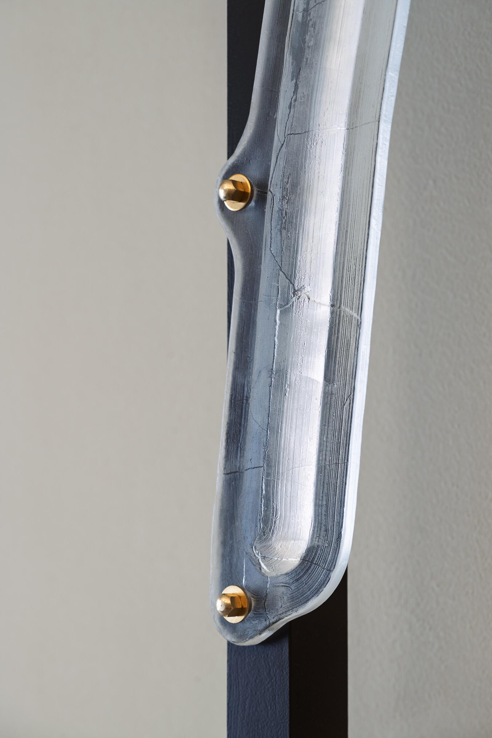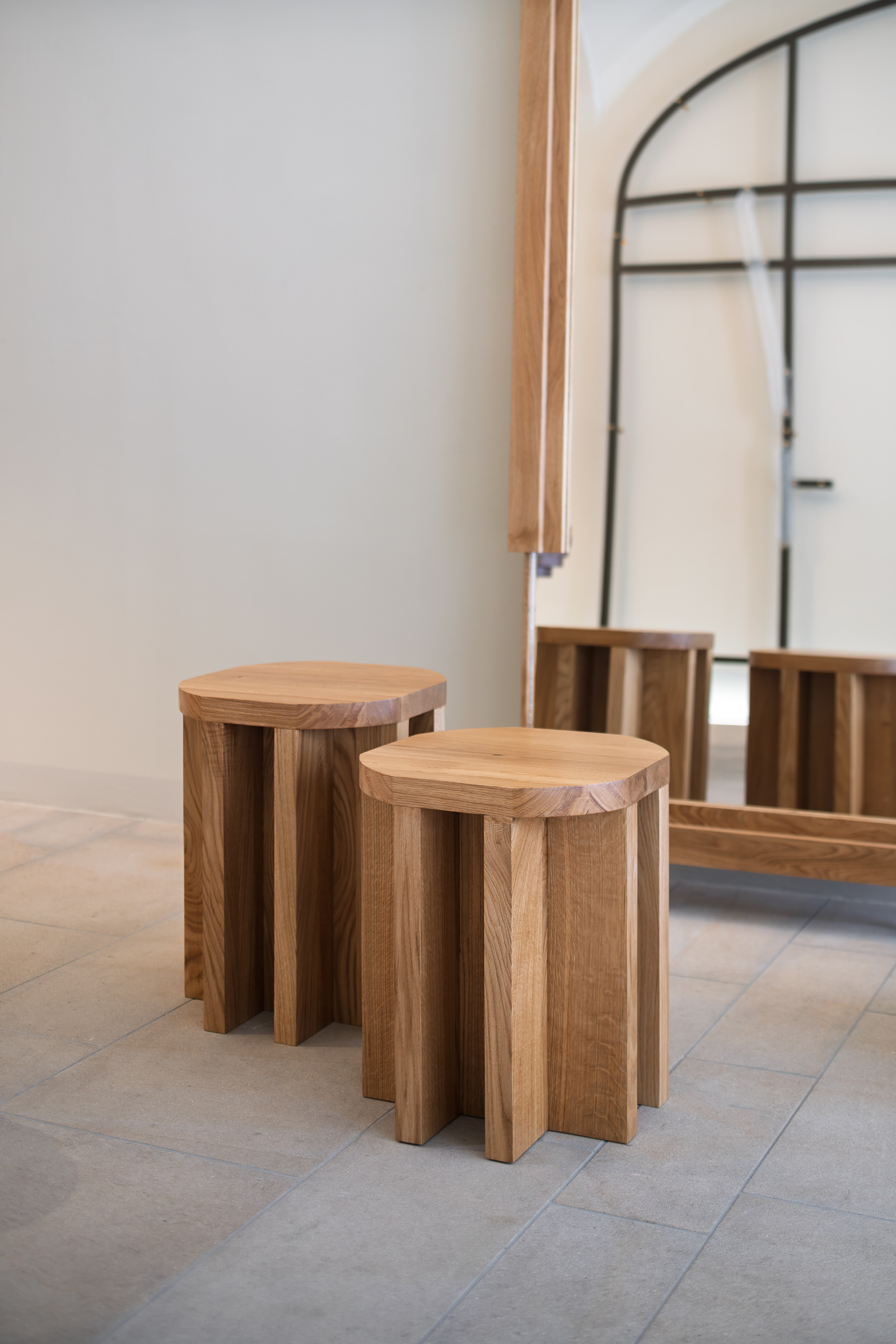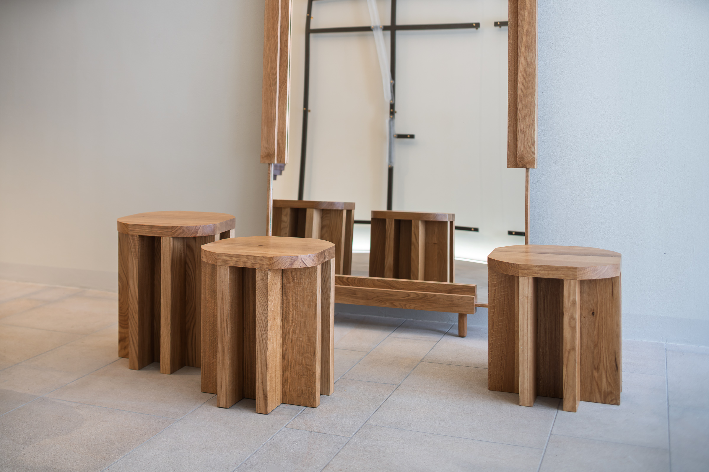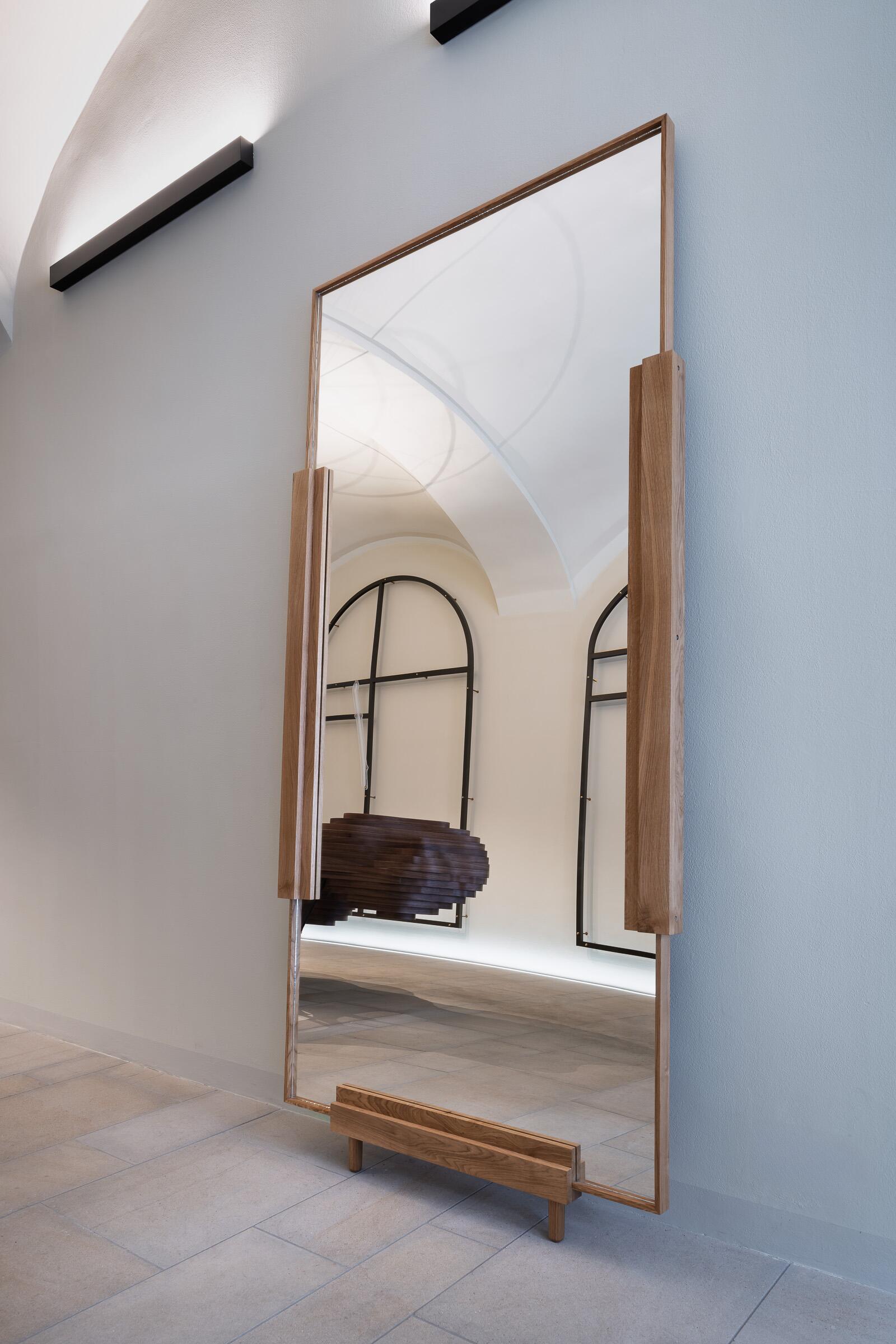 The wall art piece works with the shape of 14th-century city wall built along the moat that originally ran down Na Příkopě street. This shape is divided into four glass segments, which are partly repeated on wooden frames inspired by the shape of shop windows. While the glass shapes gradually decrease in number leading to a single shape that incorporates the position of the 100 Yards building. The frames are forming to the complete and clear shape. By the move outside the building, the entire process repeats in the opposite way and decrease into an abstract shape.