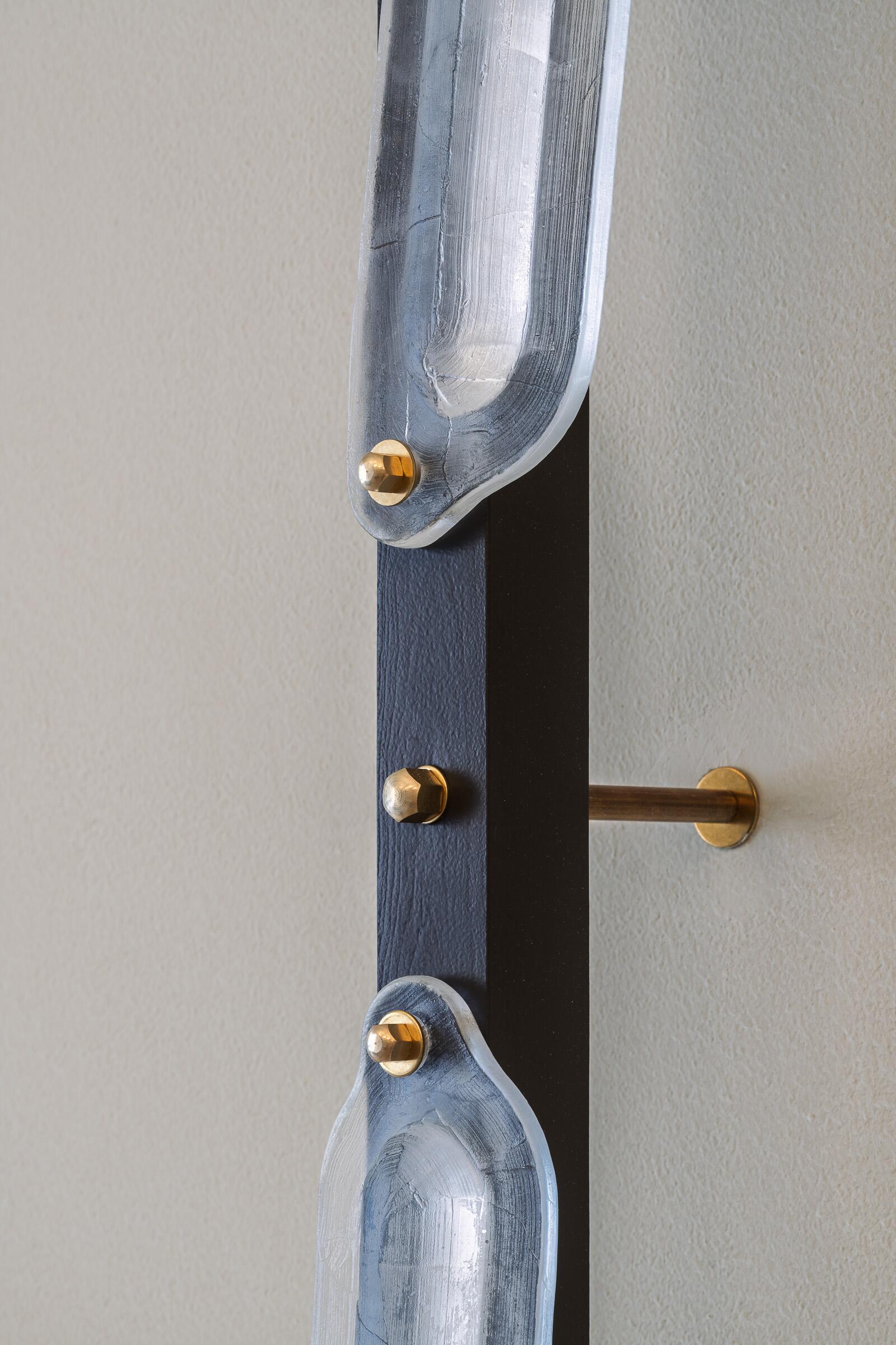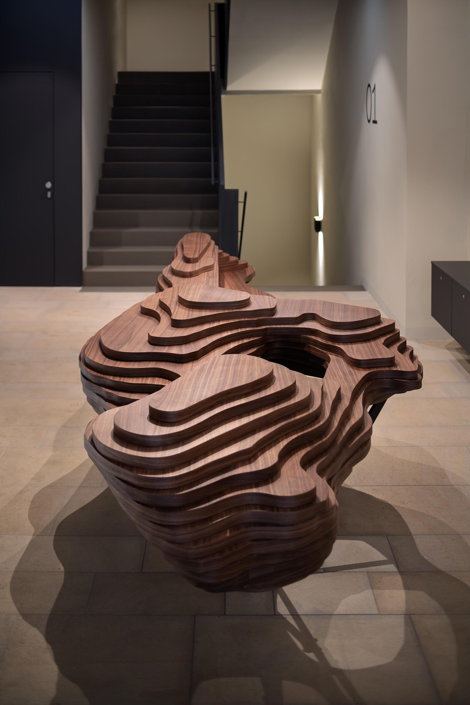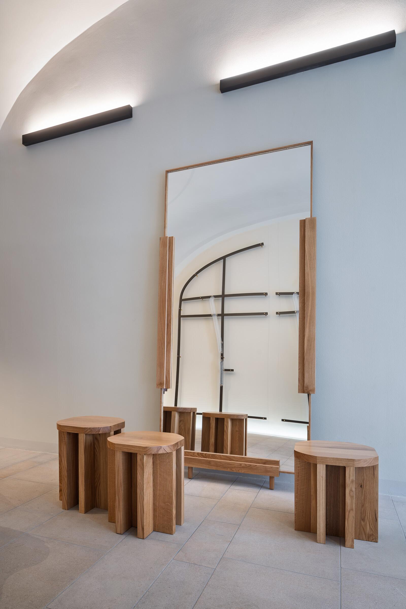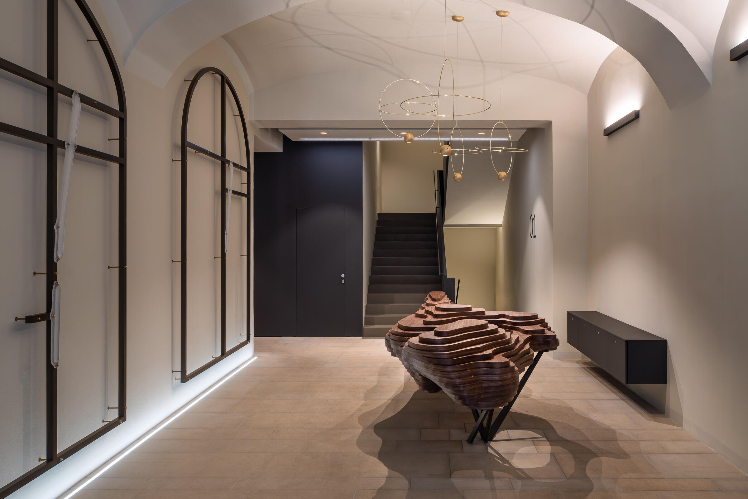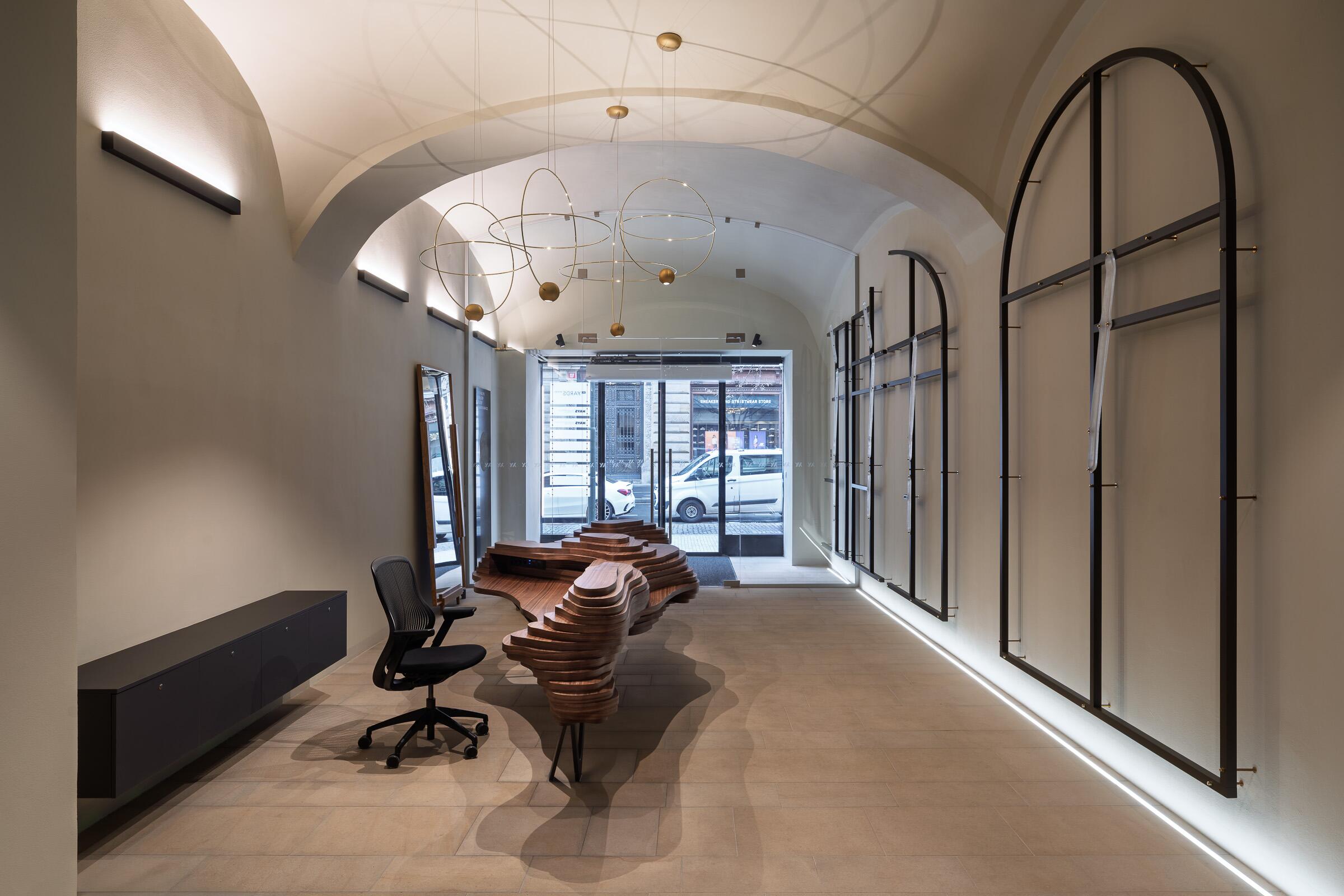 The wall art piece works with the shape of 14th-century city wall built along the moat that originally ran down Na Příkopě street. This shape is divided into four glass segments, which are partly repeated on wooden frames inspired by the shape of shop windows. While the glass shapes gradually decrease in number leading to a single shape that incorporates the position of the 100 Yards building. The frames are forming to the complete and clear shape. By the move outside the building, the entire process repeats in the opposite way and decrease into an abstract shape.